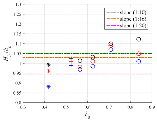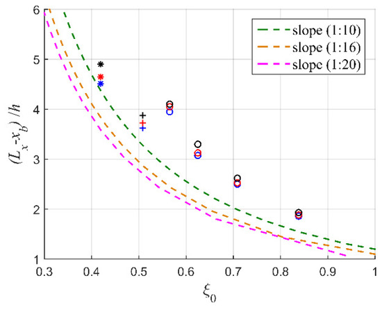 The correlation between the wave breaking locations and surf similarity parameter . Symbols ○, +, ∗ denote numerical data with a slope of 1:10, 1:16, and 1:20, where the wind speed of 0 m/s, 3 m/s, and 5 m/s are labeled by blue, red, and black, respectively. Dotted lines by Equation (15) represent the calculated results for the appropriate slope.