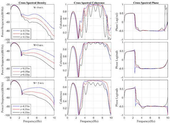 where and are filtered velocity, the overbar and comma indicate the time-averaged and residual quantities. As illustrated in Figure 12, in cases of W0H07~W5H07, the results of the cross-spectrum analysis of three levels below the trough at the location of show that the spectral energy was mainly concentrated in the low-frequency region () where the wind input was absorbed and transported. In this region the cross spectral density, coherence, and phase lag of and were basically the same for different levels and the wind speed increased the coherence peak at a depth of 0.37 cm, rising from 0.76 to 0.9, which means that the wind enhanced the degree of coherence of velocity components, and aggravated turbulence. Then, the absorbed wind input spreads further, to a high-frequency region () by nonlinear interaction, which mainly reflected that the spectral density with wind was larger than that without wind. Remarkably, the phase lag tended to disperse at for different levels, with the degree increasingly evident as the wind speed increased.