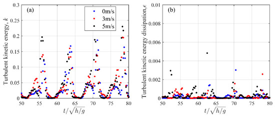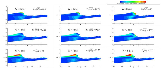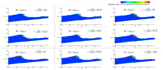 In accord with the time in Figure 7, Figure 13 and Figure 14 show the relevant snapshots of distribution of TKE and TDR obtained by Equations (17) and (18) during wave breaking. As shown in Figure 13, the maximum TKE occurred under the wave crest, near the windward wave surface. It could also be found that the turbulence owing to the surface roller was rapidly transported to the depths of the flow and the rear regions of wave front by the turbulence transformation mechanisms, and the TKE was more distributed horizontally rather than vertically [42,44]. Meanwhile, the distribution of TDR was relatively uniform with a constant order of magnitude in most regions except for the wave front and roller where the mixing of air and water with notable values exists, as shown in Figure 14. The influence of wind on TKE and TDR can be observed as well in Figure 13 and Figure 14, and as a result, there exists some differences that will be discussed in detail below.