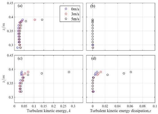 We plotted the time variations of TKE and TDR at a depth of 0.37 m below the trough level at two cross-sections before and after breaking based on the above cases, as shown in Figure 15 and Figure 16, respectively. The results show that the TKE and TDR displayed a periodic variation throughout the collection time, wherein the TKE was a bimodal distribution in each wave period. Before wave breaking (), as plotted in Figure 15a, the maximum TKE occurred at an initial breaking time and increased with wind speed. In sharp contrast with the TKE, the TDR barely felt the impact of wind, as displayed in Figure 15b. The maximum TDR occurred before initial breaking time, resulting in the phase advance. Therefore, the coherence was relatively weak as compared to the case in the TKE. Likewise, Figure 16 shows similar results after wave breaking (), since the mixing of air and water in the inner part of surf zone enhanced the turbulence intensity. Particularly in the presence of wind, the average TKE and TDR levels generally rose and were significantly larger than that before breaking, which was likely to cause the TKE and TDR to diffuse downward with more complex turbulence transformation mechanisms [44,60]. Then, we plotted the variation of time-averaged TKE and TDR with depth in Figure 17. As expected, in Figure 17a,c, both before and after breaking, the time-averaged TKE in regions near the water surface was considerably larger and rapidly decreased with the depth. It is also noted that wind enhanced the average TKE level. For time-averaged TDR, Figure 17b presents that before breaking it was found to be negligible even in the windy cases, while the significant effect of wind was imposed after breaking as given in Figure 16b, the turbulence penetrated to the deeper flow and the average level of TDR increased with wind speed.
