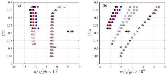 (a) Horizontal and (b) vertical time-averaged velocity profile at (triangle), (square) and (circle). The results are shown for cases W0H07 (blue), W3H07 (red), and W5H07 (black), respectively.