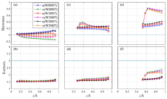 Skewness (top panel) and kurtosis (bottom panel) of horizontal and vertical velocity at (a,b) , (c,d) , and (e,f) . The results are shown for cases W0H07, W03H07, and W05H07, respectively.