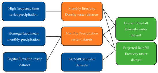 The methodology that was applied in the study, is presented in the flowchart of Figure 1, where data flows from the left to the right. Blue symbolizes the data that were used as input (pointwise and raster), orange the intermediate raster datasets that were created and green the final results, also in raster format, that were computed using different sets of input and intermediate datasets.