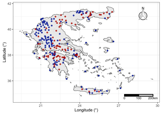 Station locations in Greece used in the analysis. Red points symbolize the 87 stations with pluviograph data from the Greek National Bank of Hydrological and Meteorological Information (NBHM) and blue points are the 150 stations with average monthly precipitation from the Hellenic National Meteorological Service (HNMS).