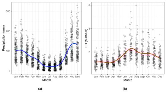 Scatterplots for: (a) Observed mean monthly precipitation values; (b) Calculated ED monthly values. In the above plots jitter exists in order to make visible all points. With color are the smooth lines produced by means of Local Polynomial Regression Fitting [81].