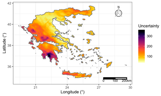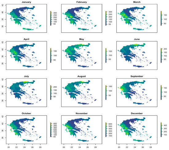 The cross validation error metrics of the models for monthly precipitation were satisfactory (Table 5), especially comparing them to recent precipitation models for Greece that showed weak correlation during the spring season [17] or equally good estimations [23]. As most months had a z-score variance smaller than one, these monthly models overestimated the actual prediction uncertainty (i.e., the error of prediction the error from the models in cross-validation locations).
