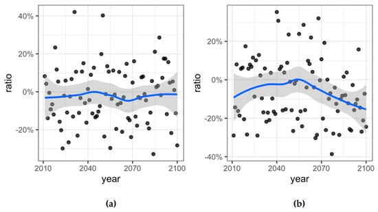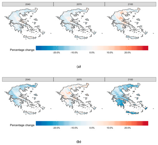 Global Circulation Models (GCMs) are models that represent the atmosphere, land surface, ocean and sea ice and simulate their interactions in three dimensions, to make long-term predictions of climate [24]. Different scenarios about future concentrations of greenhouse gases (Representative Concentration Pathways, RCPs) are employed to describe a set of different climate futures that drive GCMs [25]. Due to the coarse grid scale of GCMs (over 80 to ~300 km), Regional Climate Models (RCMs) were developed to downscale them and provide information on a finer scale, more applicable to local scaled phenomena, impact studies and adaptation decisions. RCMs are dependent on GCMs, because GCMs provide the response of global circulation, greenhouse gases concentrations, etc. and RCMs refine them in a spatiotemporal sense, using features such as the topography, coastlines, land cover or mesoscale dynamics [26]. The climatic models from COordinated Regional Climate Downscaling EXperiment over Europe (EURO-CORDEX) [27], using high-resolution RCMs for the high greenhouse gases concentration scenario, RCP8.5, project a decrease of precipitation from 1971–2000 to 2071–2100 and for the medium concentration scenario, RCP4.5, project the same trend with a smaller magnitude [27,28]. Regarding rainfall intensity, in the form of heavy precipitation that exceeds the intensity at the 95th percentile of daily precipitation, the same models project diverging trends that are not statistically significant in most areas of Greece [27,28].