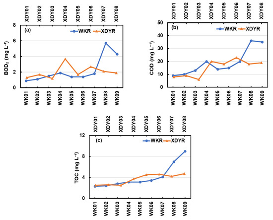 3.2. Spatial Variations of Water Quality Parameters Related to Organic Pollutants