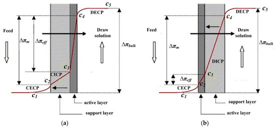 Concentrative ECP (CECP) takes place when the dense active layer faces the draw solution due to the diffusion of water from the side of the feed to that of the draw solution, resulting in the accumulation of draw solute in the active layer face, whereas dilutive ECP (DECP) occurs when the dense active layer faces the draw solution due to the diffusion of water from the side of feed to that of the draw solution [26].