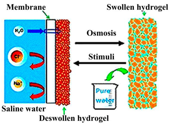 Schematic representation of the polymer hydrogel-forward osmosis desalination process. Reprinted from Reference [36] with permission from The Royal Society of Chemistry.