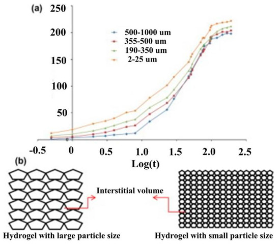 Semi-logarithmic plot of the effect of particle sizes on the swelling ratio of 0.1 g N-isopropylacrylamide-sodium acrylate (NIPAM-SA) hydrogels (a), and the schematic illustration of the interstitial volume in small and large hydrogel particles (b). Reprinted from Reference [50] with permission from Elsevier.