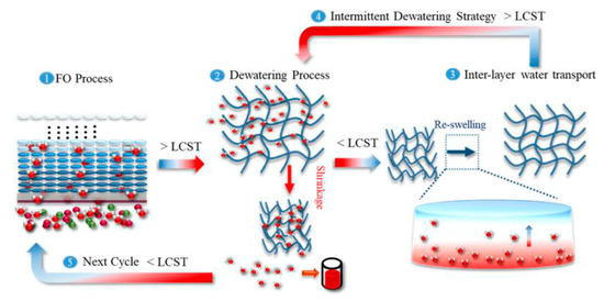 Schematic of continuous semi-batch FO process using bilayer thermo-responsive hydrogels as the draw agent. Reprinted from Reference [66] with permission from Elsevier. LCST: lower critical solution temperature.