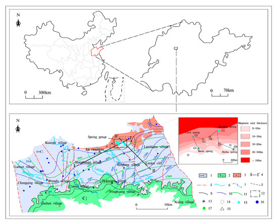 From the regional hydrogeological conditions, the Cambrian Fengshan Formation-Ordovician limestone is a unified aquifer, while the Changshan Formation-Gushan Formation has no karst development and has certain water permeability. The tracer tests confirm that the Cambrian Zhangxia Formation aquifers have a hydraulic connection with the spring water [26]. This indicates that the connection between the fault zone and the igneous rock contact zone enabled the spring group to be recharged by both the Ordovician Formation-Fengshan Formation aquifer and Zhangxia Formation aquifer.
