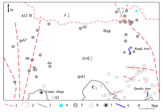 Map of tracer monitoring points. 1: fault; 2: magmatic rock; 3: Cambrian Fengshan Formation bottom limit; 4: spring group; 5: Cambrian Zhangxia aquifer monitoring point; 6: Ordovician aquifer monitoring point; 7: tracer drop well in Cuima village; 8: tracer drop river course in leakage section of Xingji and Quanlu river.
