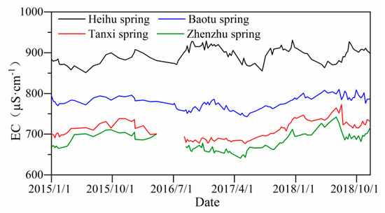 According to the statistics of the measured conductivity data of the four springs from January 2015 to December 2018 (Figure 3 and Table 1), the EC curve of the springs of the same spring group is stable, and the range is less than 100 µS·cm−1. There is a large difference in the conductivity of springs between different spring groups. In general, the relative EC of the four major spring groups in descending order is: Heihu Spring > Baotu Spring > Tanxi Spring > Zhenzhu Spring.