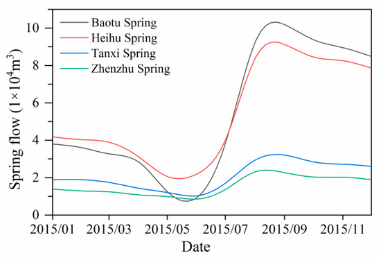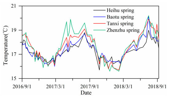 According to the monitoring data of the spring water temperature of the four major springs from September 2016 to September 2018 (Figure 4), the spring water temperature narrowly fluctuates between 16 and 19 °C. The relative temperature of the spring water follows this ascending order: Heihu Spring ≤ Baotu spring < Tanxi Spring < Zhenzhu Spring.