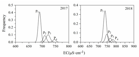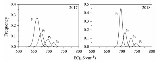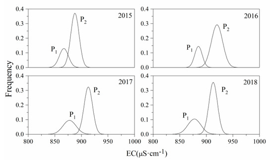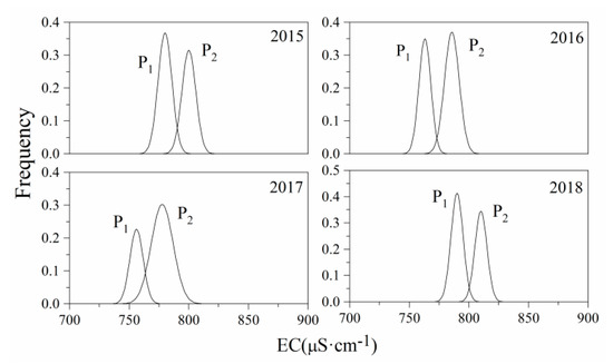 The frequency analysis of the EC of the Heihu Spring and Baotu Spring indicates that the positions of P1 and P2 in CFDs are relatively unchanged in the past years. This means that the spring water has been replenished by two water source components for many years and is unaffected by the external environment. Based on the conclusion that the Baotu Spring and Heihu Spring mainly accept the recharge of Ordovician fracture-karst water and Cambrian Zhangxia Formation karst-fractured water, it is inferred that peak P1 and P2 are interpreted as the Ordovician fracture-karst water and Cambrian Zhangxia Formation karst-fractured water.