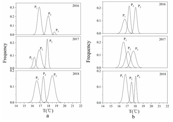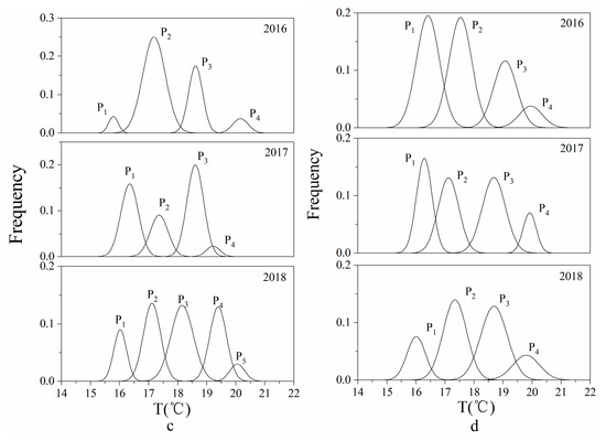 Based on the spring water temperature data of the four major spring groups in 2016–2018, the water temperature frequency distribution curve is plotted (Figure 9). The Baotu Spring and Heihu Spring both show three peaks, while the Tanxi Spring and Zhenzhu Spring show 4–5 peaks.