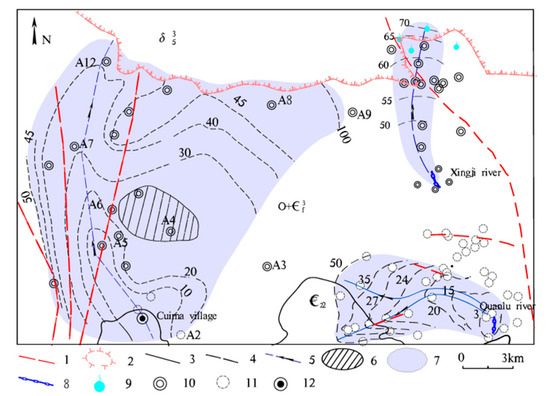 The tracer selected for the tracer test was ammonium molybdate (NH4) 6Mo7O24·4H2O. The peak amount of molybdenum ion concentration at the spring water receiving point was 15 ppb. This amount was estimated based on the characteristics of the flow field in the study area, and the formula for the amount of tracer [32]. The first tracer test was performed at Cuima Village (Figure 2). In that test, 250 kg of ammonium molybdate was dropped into the source hole with a depth of 201.8 m, and the water level was buried at a depth of 49.65 m. The release strata were the Cambrian Zhangxia Formation aquifer, with a total of eight spring water sampling sites and 29 karst water sampling sites of the Cambrian and Ordovician limestone. In the second tracer test, a reagent was placed in the Quanlu River Channel, and ammonium molybdate was injected into the channel sinkhole so that it entered the Cambrian Zhangxia Formation limestone aquifer. In that test, 44 Cambrian Zhangxia aquifer sampling wells were arranged. There are 18 Ordovician aquifer sampling wells and seven spring sampling points for a total of 5216 tests. The third tracer placement point was the Xingji River. The exposed stratum in the channel was the Cambrian Fengshan Formation limestone, with 17 karst water monitoring points and 10 spring water monitoring points.