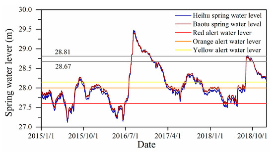 The karst observation of the cores near the four spring groups revealed that void types (e.g., pores, solution crack, fissures, and karst caves coexist in the karst aquifer) form the storage space and runoff channel of the karst water system in Jinan. The depth above 100 m is primarily the limestone of the Ordovician Sanshanzi Formation, with karst developed. The development rates of karst caves at the depths of 10–20 m, 30–40 m, 60–70 m, and 70–80 m reach 10.92%, 16.15%, 17.46%, and 17.31%, respectively. The buried depth of 100-200 m contains the limestone of Changshan Formation and Gushan Formation, and the fissure is not developed. The depth below 300 m is primarily the limestone of the Zhangxia Formation, with fissures developed. Recent drilling statistics suggested that the karst development rate of the Ordovician Sanshanzi Formation limestone aquifer was higher than 50%, and the deep Cambrian karst rate was lower than 20% [29]. Apparently, in the vertical direction, the karst development degree near the spring group gradually weakens with increasing depth. The shallow-buried Ordovician limestones have developed cracks and karsts, but the deep-buried Cambrian Zhangxia Formation has low karst development, mainly karst cracks. Therefore, during the wet season, shallow karst pipeline flows and karst cave flows can receive concentrated atmospheric precipitation replenishment quite quickly, and the spring water levels rise. According to the long-term records of the Baotu Spring and Heihu Spring (Figure 11), the spring water level shows the characteristics of rapid rise in the wet season and long-term decay in the dry season. When the water level of the Baotu Spring is lower than 28.67 m, it is lower than that of the Baotu Spring. When the water level of the Heihu Spring is around 28.67–28.81 m, the water level of the Heihu Spring and Baotu Spring differs by −0.01–0.01 m, and the elevations of the two are basically the same. When the water level of the Heihu Spring exceeds 28.81 m, it is higher than that of the Baotu Spring. Relative to the Baotu Spring, the shallow karst in the spring water recharge area of the Heihu Spring is more developed, and the rainfall infiltration is rapid.