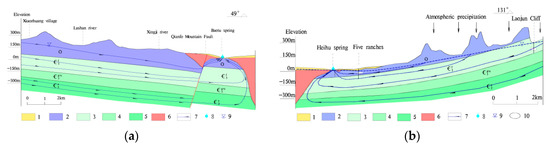 Schematic diagram of geological section. (a) I-I’; (b) Π-Π’ 1: Quaternary clay; 2: Ordovician carbonate; 3: Cambrian Fengshan Formation limestone; 4: Cambrian Gushan Formation and Changshan Formation limestone; 5: Cambrian Zhangxia Formation limestone; 6: magmatic rock; 7: groundwater flow line; 8: spring group; 9: water level; 10: karst cave.