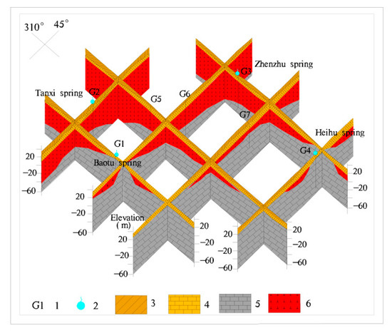 Geological three-dimensional structure of the spring. 1: boring number; 2: spring; 3: cohesive soil; 4: gravel layer; 5: limestone; 6: magmatic rock.