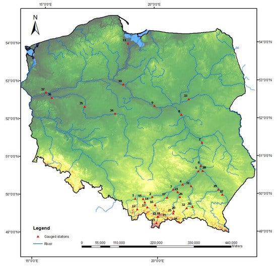 In this paper, the data of seasonal maximum flows from 37 gauging stations at Polish Rivers were investigated. The stations are listed in Appendix A (Table A1), along with the observation periods and the mean value of both the summer and winter maximum flows, while the location of all stations is illustrated in Figure 1. The studies mainly focused on the catchment of the Vistula Basin, which is characterized by high flood potential in its southern part. Here, the dominance of summer floods caused by intensive, long-lasting rainfall is observed. Gauging stations in the central part of the country represent mainly a snowmelt or mixed snowmelt-rainfall flood regime.