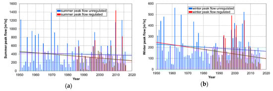 The mean of unregulated flow maxima in 1951–2016 for summer peak flows was 433 (m3/s), and for winter peak flows it was 213 (m3/s), while the variation coefficient Cv was 0.718 and 0.569, respectively.