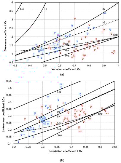 Skewness coefficient versus variation coefficient for two-parameter distributions and Polish data of summer (red color) and winter (blue color) peak flows for 37 gauging stations: (a) conventional moment ratio diagrams of Cs vs. Cv; (b) linear moment ratio diagrams of LCs vs. LCv. Key to the distributions: Ga—gamma, We—Weibull, GE—generalized exponential, IG—inverse Gaussian, LN—log-normal, LL—log-logistic, LG—log-Gumbel, Exp—exponential.
