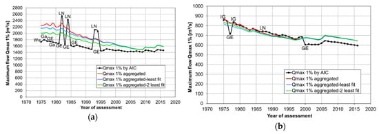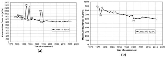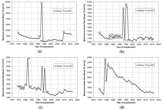 For the series of maximum summer flows (Figure 4a), a significant difference in the estimates of 1% quantile was observed in the years 1982, 1984, and 1993–1994. Then, the type of the best fitted distribution changed from GE to LN, resulting in a significant increase in design value. The changes of other types of distribution did not cause such large changes in the estimates. It is worth noting that the peaks in the estimation curve are related to those of the smallest value of the observations, especially the peaks in 1982 and 1993 (see Figure 4a). For the series of maximum winter flows (Figure 4b), the greatest decreases were observed in 1977 and 2000. These were due to the change in the distribution type from IG or LN into GE. Moreover, in 2005–2006, there was a two-step increase in the 1% quantile estimates. Since 2000, the GE was the best fit distribution among the seven competing models, the jump was due to a change in the parameters of the current (GE) distribution with the addition of observations from 2005 and 2006. Interestingly, the largest shifts in the estimation curve (i.e., in 1977 and 2000) were downhill and were associated with those of the highest observation values (see Figure 4b).