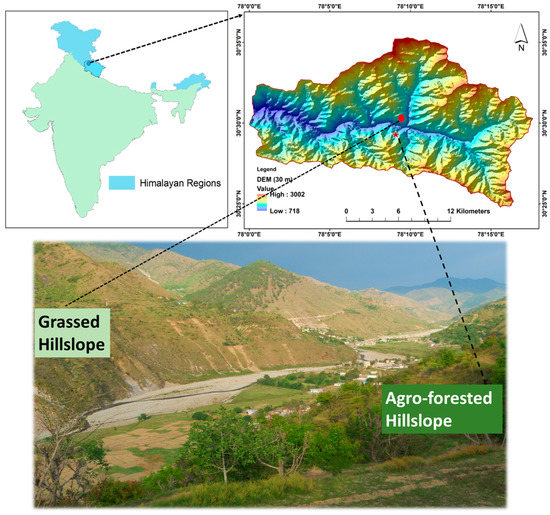 Location of Aglar watershed in map of India; both aspects of watershed showing the location of grassed (GA) and agro-forested (AgF) hillslopes in Digital Elevation Model (DEM) (reproduced from Figure 1 of Nanda et al. [29] with the copyright permission from Elsevier office).