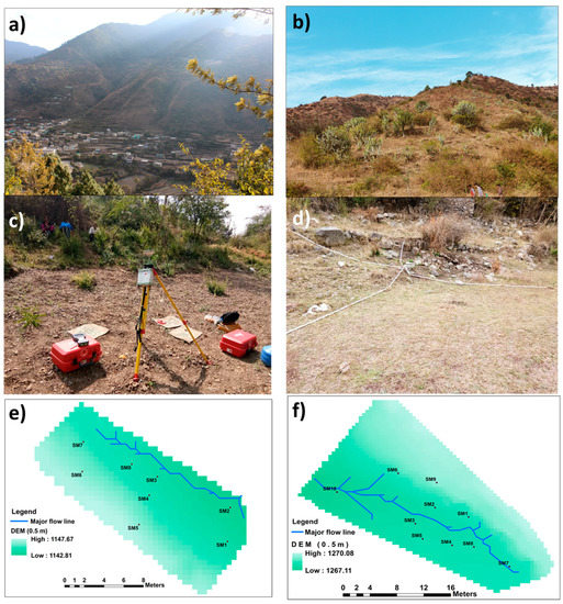 (a) North aspect of watershed dominated with agricultural lands and forests; (b) south aspect of watershed dominated with bushes of Cactaceae family; (c) agro-forested hillslope during real-time kinematic (RTK) GPS survey; (d) grassed hillslope during soil moisture sensors installation; (e) 0.5 m resolution DEM of AgF hillslope showing major flow lines and locations of soil moisture; (f) 0.5 m resolution DEM of GA hillslope showing major flow lines and locations of soil moisture installation point (reproduced from Figure 1 of Nanda et al. [29] with the copyright permission from Elsevier office).