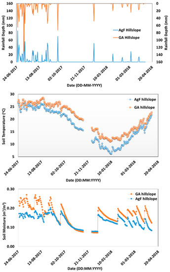 Time series of rainfall, soil moisture, and soil temperature for AgF and GA hillslopes.