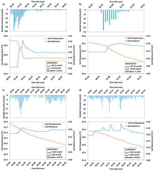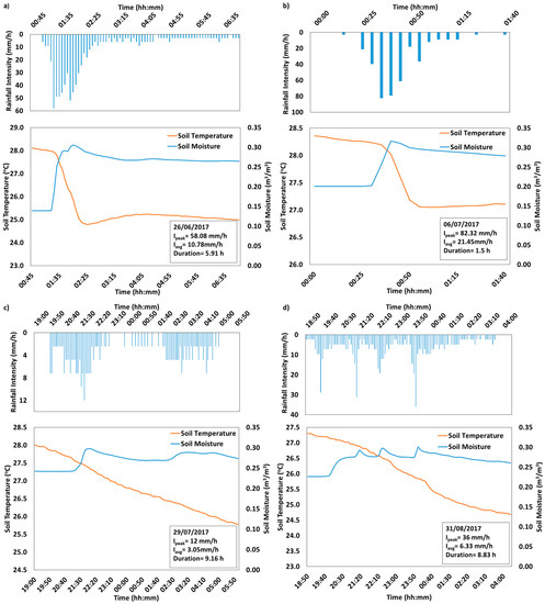 Influence of rainfall on soil moisture and soil temperature dynamics in GA hillslope during four different rainfall events (a–d). The details about the rainfall events are mentioned in lower right corner of the plots.
