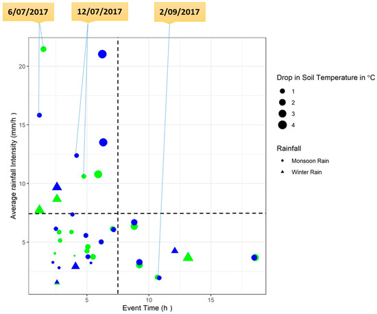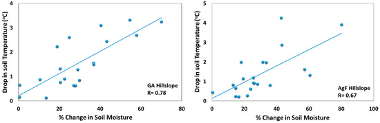 To understand these phenomena more clearly, the bubble graph [40] is plotted between event duration (h), event average rainfall intensity (mm/h), and drop in soil temperature in Figure 6. The significant drop in temperature is noticed during two situations, either when the rainfall duration is greater than 7.5 h or when the event average rainfall intensity is more than the 7.5 mm/h. The drop in soil temperature is less than 1 °C when the event duration and event average rainfall intensity is less than 7.5 h and 7.5 mm/h, respectively. Some expectations are also observed during the 6 July 2017 and 2 September 2017 rainfall events. The rainfall event on 6 July 2017 has a high average rainfall intensity but very short event duration (1.1 h) whereas the event on 2 September 2017 has a very low average rainfall intensity (<2.5 mm/h) with long event duration (>10 h). Thus, these two rainfall events show a very reduced drop in soil temperature even after exceeding the threshold value. It can also be observed that the short duration of winter rainfall was able to decrease the soil temperature significantly (>2 °C). For the similar average rainfall intensity and event duration condition, the temperature dropped by winter rain is higher than the monsoon rain. It is due to the freezing atmospheric temperature which affects the rainwater and soil temperature directly. Moreover, the drop in soil temperature is higher at the GA hillslope in comparison to the AgF hillslope which can be correlated with the amount of water infiltrated to each hillslope during rainfall events. The infiltration capacity of the GA hillslope is greater than the AgF hillslope. Further, we calculated the correlation between percentage changes in soil moisture and a drop in soil temperature (Figure 7). A significant correlation (p < 0.01) was found between these two variables with a coefficient value of 0.78 and 0.67 for GA and AgF hillslopes, respectively.