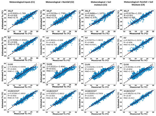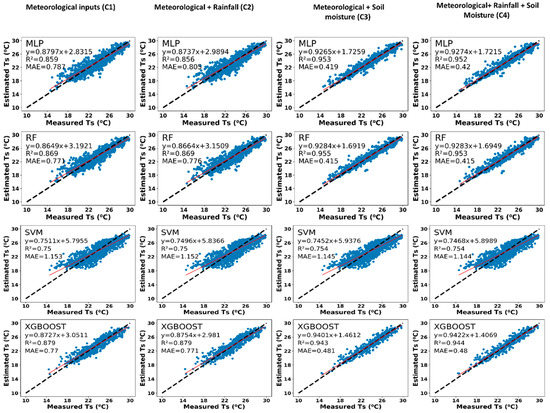 In this study, MLP, RF, SVM, and XGBoost models were used along with four different input combinations to create 16 different soil temperature estimation models for each time-scale and hillslope. Modeling of soil temperature for half-hourly and hourly scale was performed. The scatter plot between estimated and measured half-hourly soil temperature for the GA hillslope is presented in Figure 8. As presented in the figure, except for SVM, the other three models were able to capture the half-hourly soil temperature dynamics. Moreover, no improvement in soil temperature estimation was observed after adding rainfall components to meteorological inputs (Rs, Ta, RH, and VPD). Although a significant improvement in accuracy of soil temperature models was witnessed after using soil moisture along with the meteorological variables. The R2 value of MLP, RF, and XGBoost algorithm was found to be 0.859, 0.869, and 0.879, respectively for combination C1 (i.e., only meteorological); however, it was 0.953, 0.955, and 0.943, respectively for combination C3 (i.e., meteorological and soil moisture). The mean absolute error of MLP, RF, and XGBoost algorithm significantly reduced by 46.75%, 46.17%, and 37.5%, respectively after adding soil moisture to the meteorological inputs. For C1, XGBoost performed better than the MLP and RF algorithms. However, for C3, the RF model performed better than the MLP and XGBoost. The performance of hourly soil temperature estimation models for the GA hillslope is presented in Figure 9. Similar to the half-hourly results, it can also be seen from hourly regression plots that the efficiency of the SVM model is weaker than the MLP, RF, and XGBoost model. The significant improvement in model R2 from 0.864, 0.87, and 0.873 to 0.92, 0.924, and 0.965 was observed for MLP, RF, and XGBoost model, respectively after using soil moisture along with the meteorological data as an input parameter. XGBoost algorithm outperformed the remaining algorithms to estimate the hourly soil temperature of the GA hillslope for all the input combinations. For the AgF hillslope, the scatter plots of half-hourly and hourly soil temperatures are shown in Figure 10 and Figure 11, respectively. For C1 inputs which include pre-defined meteorological parameters, MLP, RF, SVM, and XGBoost algorithm were performed well to estimate half-hourly soil temperature with R2 values 0.919, 0.926, 0.831, and 0.932, respectively (Figure 10). In an hourly-scale, the XGBoost and RF algorithms (having R2 0.919 and 0.926, respectively) performed better than the SVM (0.834) and MLP (0.841). The efficiency of the XGBoost model is again found to be better than other studied models for both hourly and half-hourly soil temperature estimation of AgF hillslope. For both hourly and half-hourly soil temperature estimation, the C2 and C4 models did not show any significant improvement in the estimation of soil temperature after adding rainfall to C1 and C3 input combinations (Figure 10 and Figure 11). Although after adding only soil moisture to meteorological inputs, the R2 values of half-hourly and hourly algorithms raised significantly for AgF hillslope too. The mean absolute error (MAE) values dropped by 37%, 43.5%, and 46.37% in half-hourly MLP, RF, and XGBoost models after using C3 inputs compare to C1 inputs. Similarly, for the hourly scale, the MAE values of C3 models were reduced by 48%, 21%, and 33% in comparison to the C1 model for MLP, RF, and XGBoost algorithm, respectively.