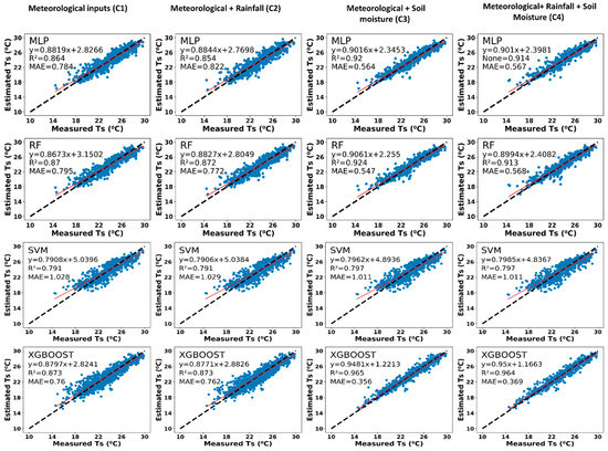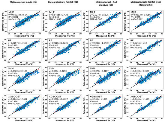 Scatter plots between estimated and measured hourly soil temperature (Ts) showing R2 and MAE of 16 different model combinations for agro-forested hillslope (black dashed line represents 45 degree line, and the red solid line represents regression line).