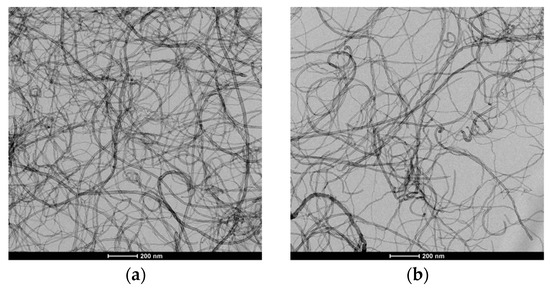 The TEM images of oxMWCNT3h and oxMWCNT6h are shown in Figure 1. The tubes are long and curved forming entangled oxMWCNTs networks. Note that the tubes have open ends as a result of the chemical functionalization (oxidation with cc. HNO3) [17]. The opening up of the tubes has led to defects on the sidewalls of the nanotubes and has shortened their length. The inner tube diameters of oxMWCNT3h and oxMWCNT6h, ranged from 7–12 and 9–18 nm respectively, while the outer tube diameters of these materials were 15–24 and 7–32 nm [27].