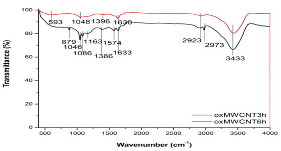 FTIR spectra of oxMWCNT3h and oxMWCNT6h.