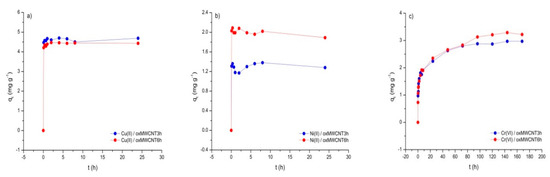 The influence of contact time on the removal of Cu(II), Ni(II) and Cr(VI) by oxMWCNT3h and oxMWCNT6h, presented as qt vs. t, is shown in Figure 3.