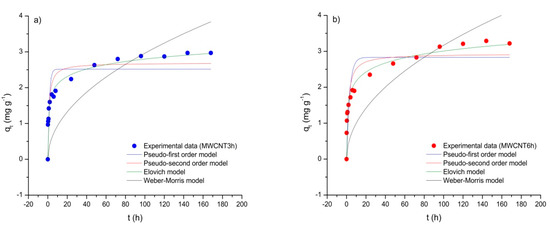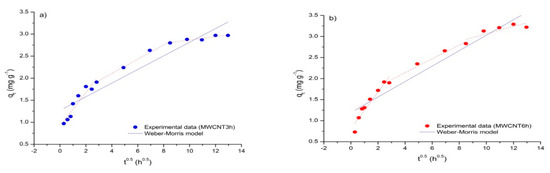 The results obtained using this approach are shown in Figure 5a,b, with the corresponding parameters given in Table 4. As can be seen, both plots are multilinear (the red dashed lines) with the linear fit across the whole range of values yielding an intercept greater than zero (in Table 2 designated Ci). Therefore, as stated in the literature, it can be concluded that intra-particle diffusion, even if not the rate dominant factor, may be involved in the adsorption of Cr(VI) on oxMWCNT3h and oxMWCNT6h. Given the results shown in the Elowich and Weber–Morris models, these adsorption processes (in terms of rate and mechanism) are most likely controlled by complex surface interactions [20,36,37].