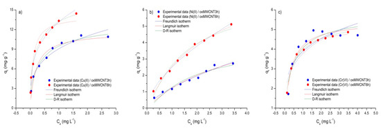In order to describe the adsorption of Cu(II), Ni(II) and Cr(VI) on the oxMWCNTs investigated more precisely, the experimental data was analyzed using the Freundlich, Langmuir and D–R equations. The non-linear fitting curves resulting from these models are shown in Figure 6, while the parameters of these functions are given in Table 5.