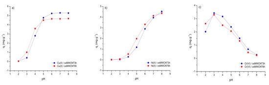 The solution pH acidity is the one matrix property with the highest potential to affect the adsorption of heavy metals. The removal of Cu(II), Ni(II) and Cr(VI) by oxMWCNT3h and oxMWCNT6h, as a function of pH, is illustrated in Figure 7.