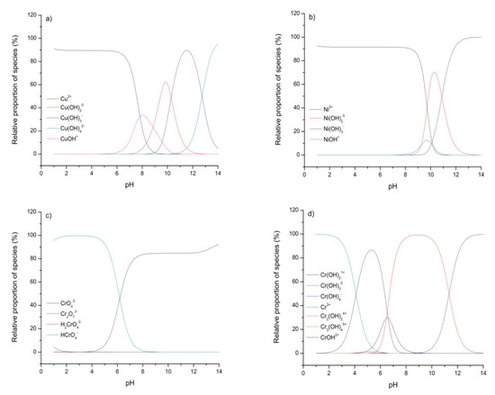 Relative proportion of: (a) Cu(II), (b) Ni(II), (c) Cr(VI) and (d) Cr(III) species as a function of pH (C0 = 1 mg L−1, ionic strength = 0.1 M NaNO3, T = 298 K).
