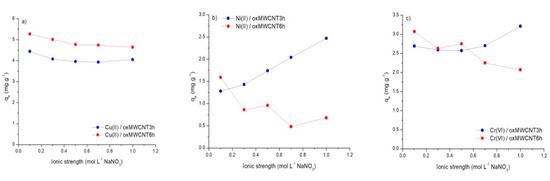 Adsorption of: (a) Cu(II), (b) Ni(II) and (c) Cr(VI) on oxMWCNT3h and oxMWCNT6h as a function of ionic strength (m = 5 mg, V = 30 mL (0.1–1 M NaNO3), C0 = 1 mg L−1, pH = 5 ± 0.1 (Cu(II) and Ni(II)) and 2.5 ± 0.1 (Cr(VI)), t = 24 h (Cu(II) and Ni(II)) and 96 h (Cr(VI)), agitation speed = 180 rpm, T = 298 ± 2 K).