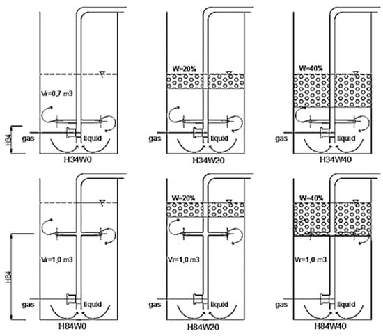 Although many sources present characteristics of two-phase flow and describe this phenomenon using mathematical models [,,], the available literature presents limited information on research concerning liquid aeration efficiency in airlift reactors and bubble columns, particularly those retrofitted with additional circulation promoting elements and/or with a filling material increasing the transfer of oxygen to the liquid []. Therefore, the need arises not only for a theoretical analysis of barbotage, but also the effects of such a system, i.e., hybrid barbotage reactors (HBR).
