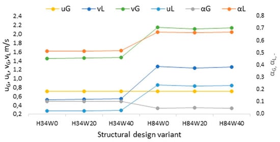 Superficial velocity of gas uG was constant for each structural design variant and amounted to 0.71 m/s; the calculated real velocity of gas vG for variant H34 was approximately 50% greater and ranged from 1.45 to 1.47, while, for variant H84, it was approximately 300% greater and ranged from 2.11 to 2.15 m/s. Superficial velocity of liquid uL also varied; for structural design variant H34, it was from 0.26 to 0.28 m/s and, for H84, it was from 0.82 to 0.85 m/s. The calculated real velocity of liquid vL was almost two-fold greater; for variant H34, it ranged from 0.5 to 0.54 m/s, while, for variant H84, it was from 1.24 to 1.27 m/s. For variant H34, the gas holdup αG, in the segment from the diffuser (6) to the nozzle pipe H, was approximately 30% greater than for the alternative variant H84. This value was approximately 0.48. The value of αL was inversely proportional to αG for all six structural design variants of the hybrid reactor. The location of nozzle pipe H at the pumping segment of the airlift (9) considerably altered proportions of the two-phase liquid–gas mixture at the segment from the diffuser (6) to the pipe element (H) and flow velocity for both mixture phases. The higher position of the nozzle pipe H (H84) increased the share of liquid in the mixture and superficial velocity, as well as actual flow of liquid.