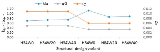 Gas holdup αG and εG and oxygen volumetric mass transfer coefficient kLa for different structural design variants of the reactor.