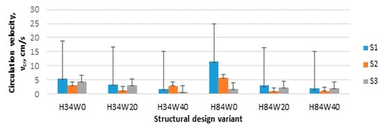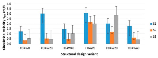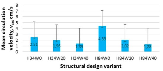 Figure 6 and Figure 7 present circulation velocity of the liquid vcr depending on the measurement point P, position of nozzle pipe H, and moving bed filling W. The vcr for the liquid in the airlift zone S1 (Figure 3) reached maximum values thanks to the raising of large air bubbles. Circulation velocity of liquid vcr was much greater at measurement point M2. Considerable flow turbulences occurred because of the tank shape, the amount of the moving bed, and the character of flow in the liquid (Figure 6 and Figure 7).