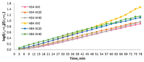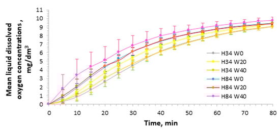 Parameters of the aeration process were calculated using the above-mentioned equations. Oxygenation capacity OC was determined for all the structural design variants H and reactor packing W (Equation (1)). The calculations were performed at 3-min intervals and for all the pre-determined measurement levels P. Values of diffusion constants were interpolated for the measured temperature according to the table given by Suschka et al. []. Measured oxygen concentrations were used to plot the oxygen volumetric mass transfer coefficient kLa, following the methodology presented by Suschka et al. []. Using Equation (2), the value of OC0 was calculated for each design variant.